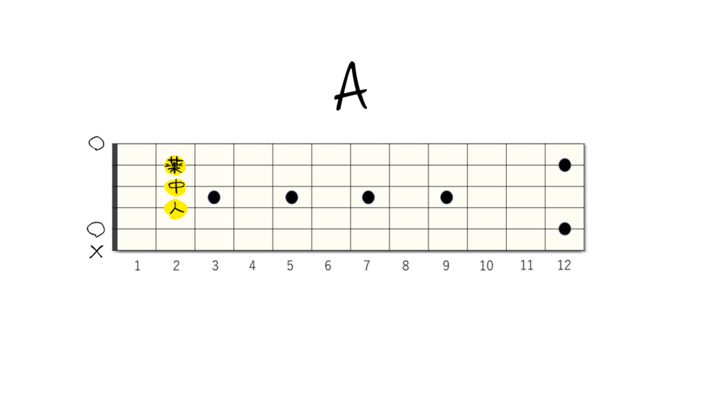 - A(エーメジャー):2弦、3弦、4弦の2フレットを押さえます。