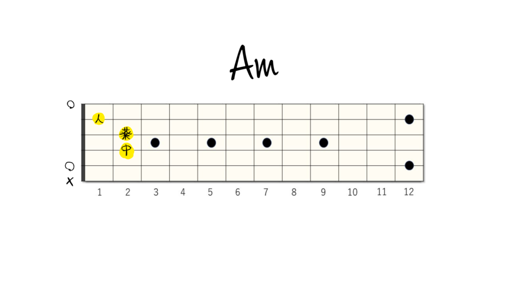 - Am(エーマイナー):2弦の1フレット、3弦の2フレット、4弦の2フレットを押さえます。