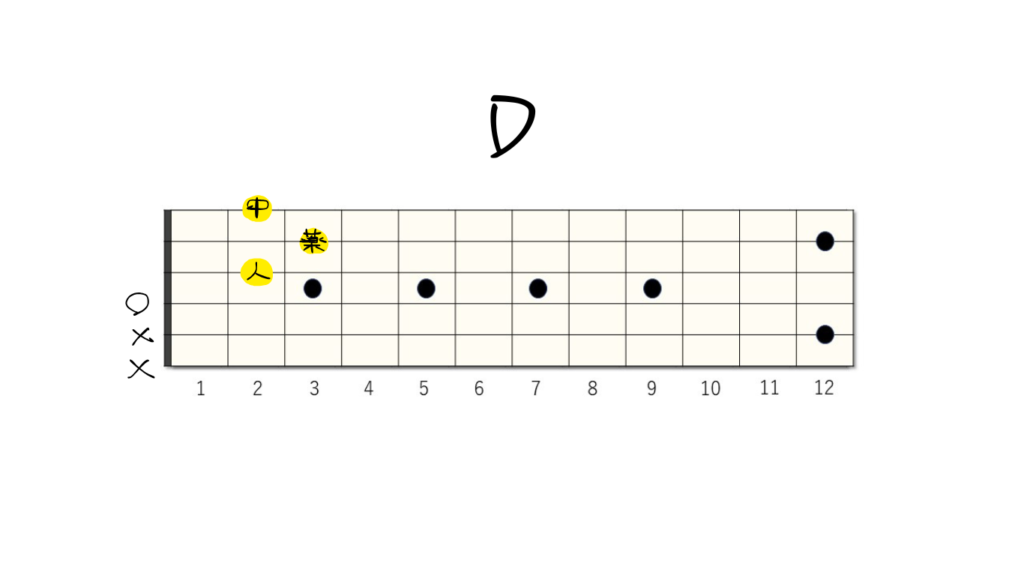 - D(ディーメジャー):1弦の2フレット、3弦の2フレット、2弦の3フレットを押さえます。