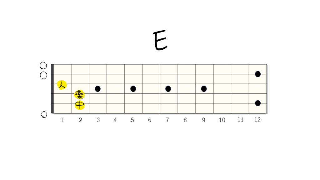 - E(イーメジャー):1弦、2弦、3弦の1フレットを押さえます。