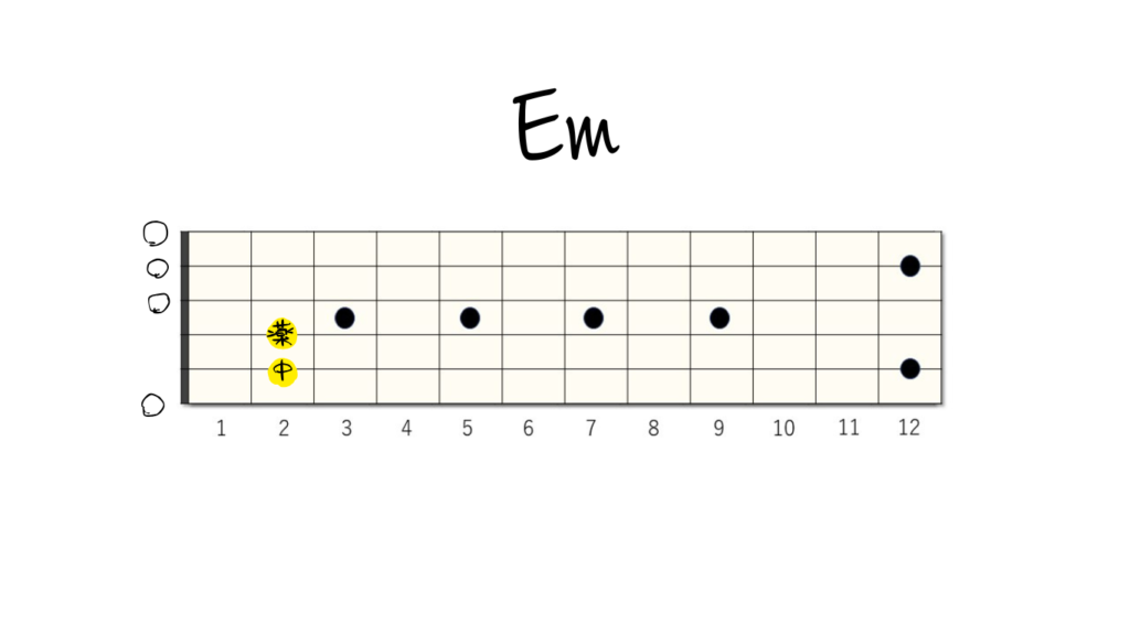 - Em(イーマイナー):2弦と3弦の2フレットを押さえるだけの簡単なコードです。
